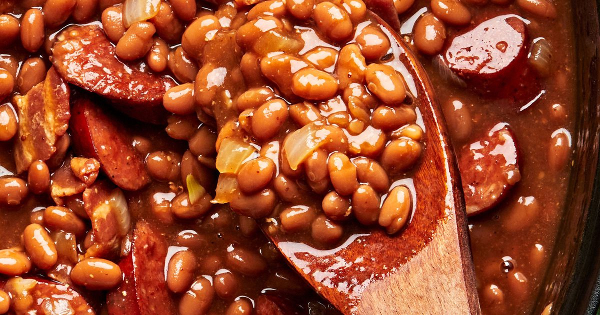Brimming with bacon, spicy mustard, and sausage, these dressed-up baked beans take those boring old canned baked beans and make them interesting!
