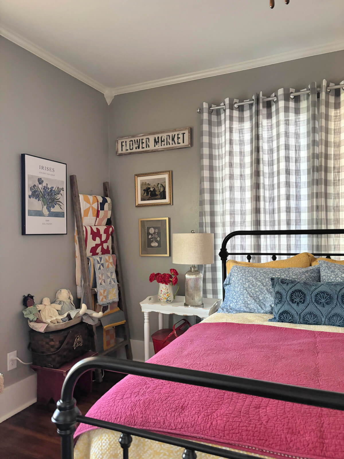 I love the way you have styled your bed! It’s very colorful and welcoming! And the quilts on the “ladder” are charming! Well done, Brenda! (I might add that I have lived in my current house for 4 years and have yet to put curtains in the guest room, or added a cozy rug to the hardwood floor, or put a bedspread on the bed!)