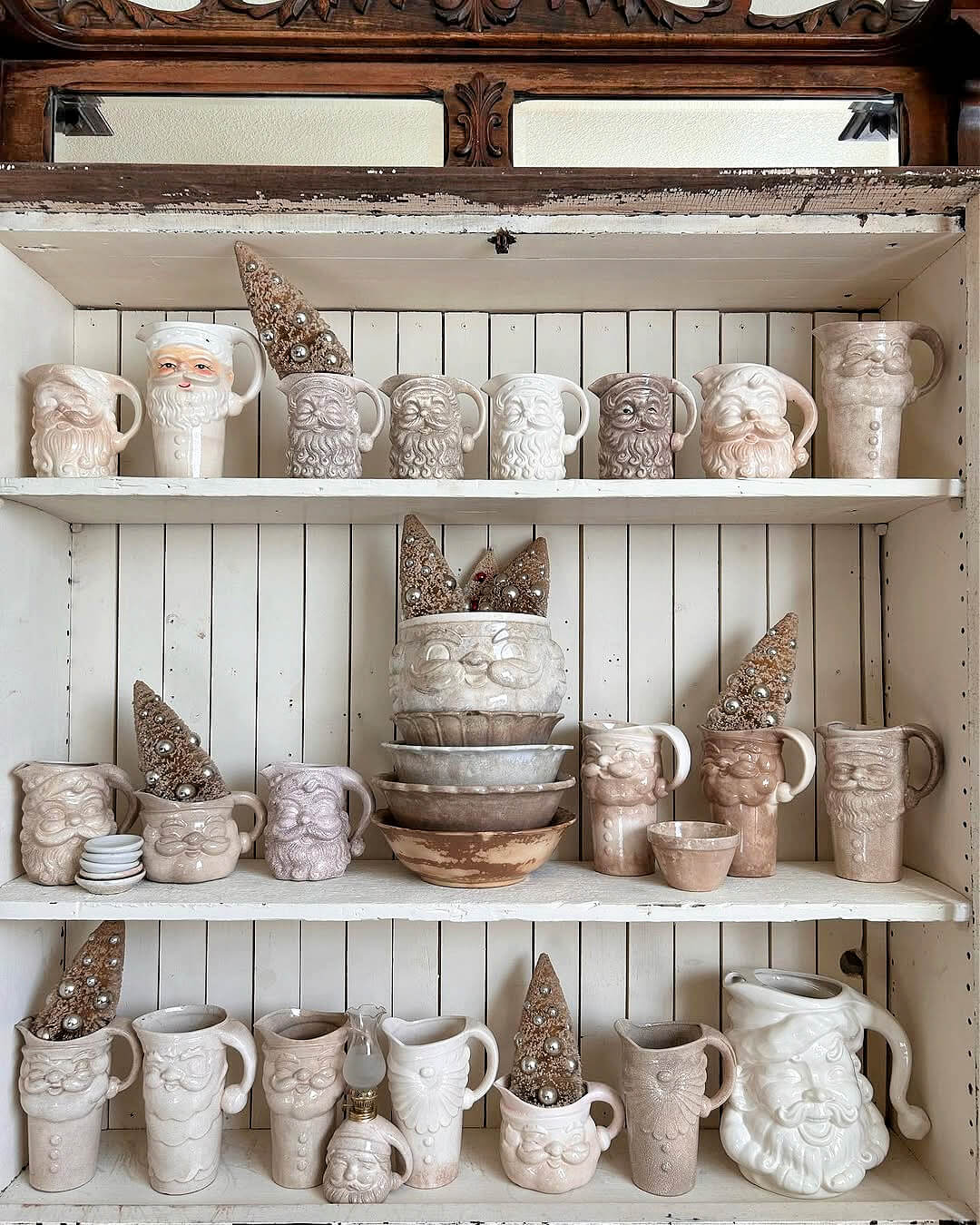 Display a collection of Santa mugs for an instant dose of holiday spirit. Their red and white hues pop beautifully against neutral cabinetry. A collection of different styles, vintage or new, makes the display even more delightful.