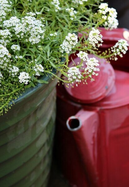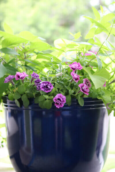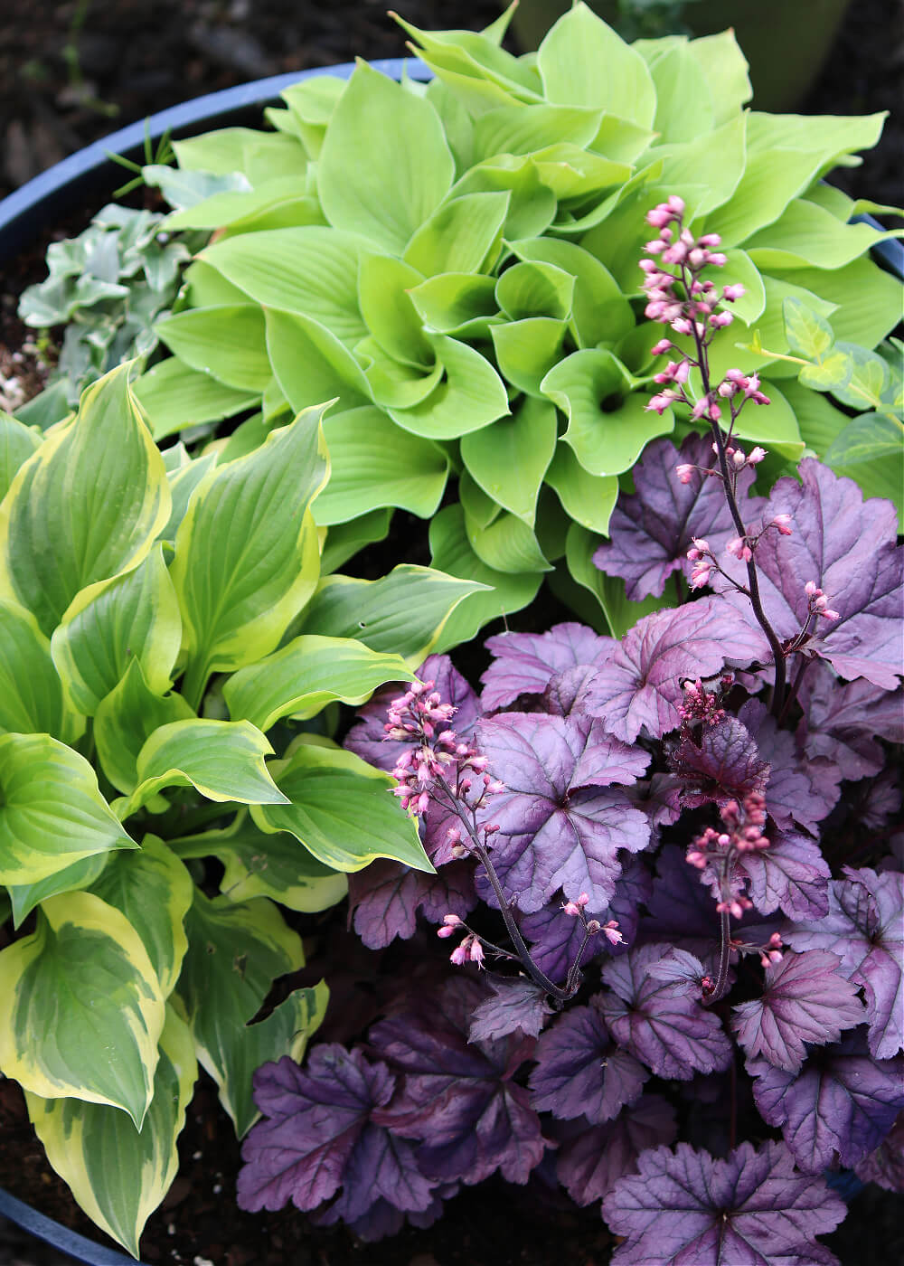 With container gardens, you can choose plants and flowers that prefer the same amount of sun or shade and put them together. I like to pair light green shades with darker greens and variegated leaves.