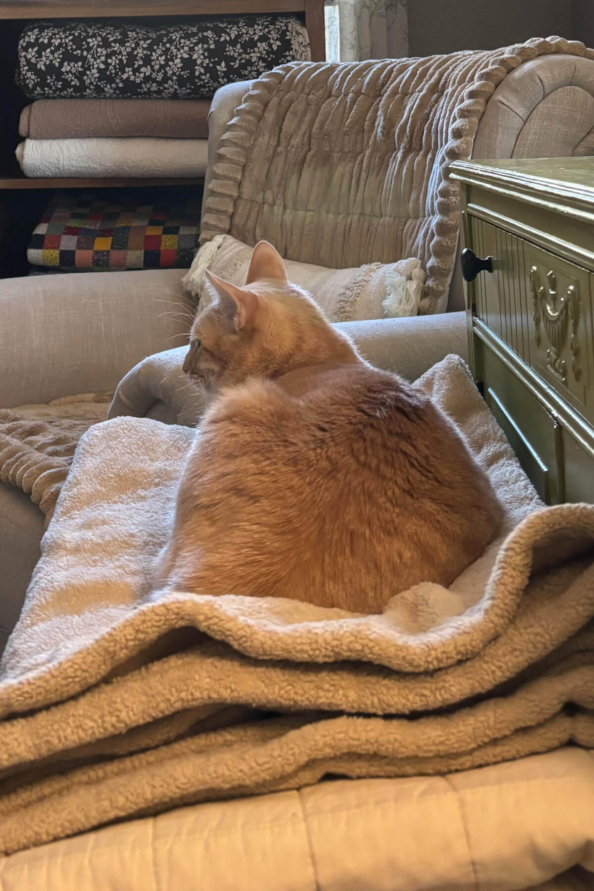 Daisy is lying here next to me on the folded blankets folded up on the upholstered bench. She has become much more social in the past month, wanting to be near me or lying on my chest for short periods.