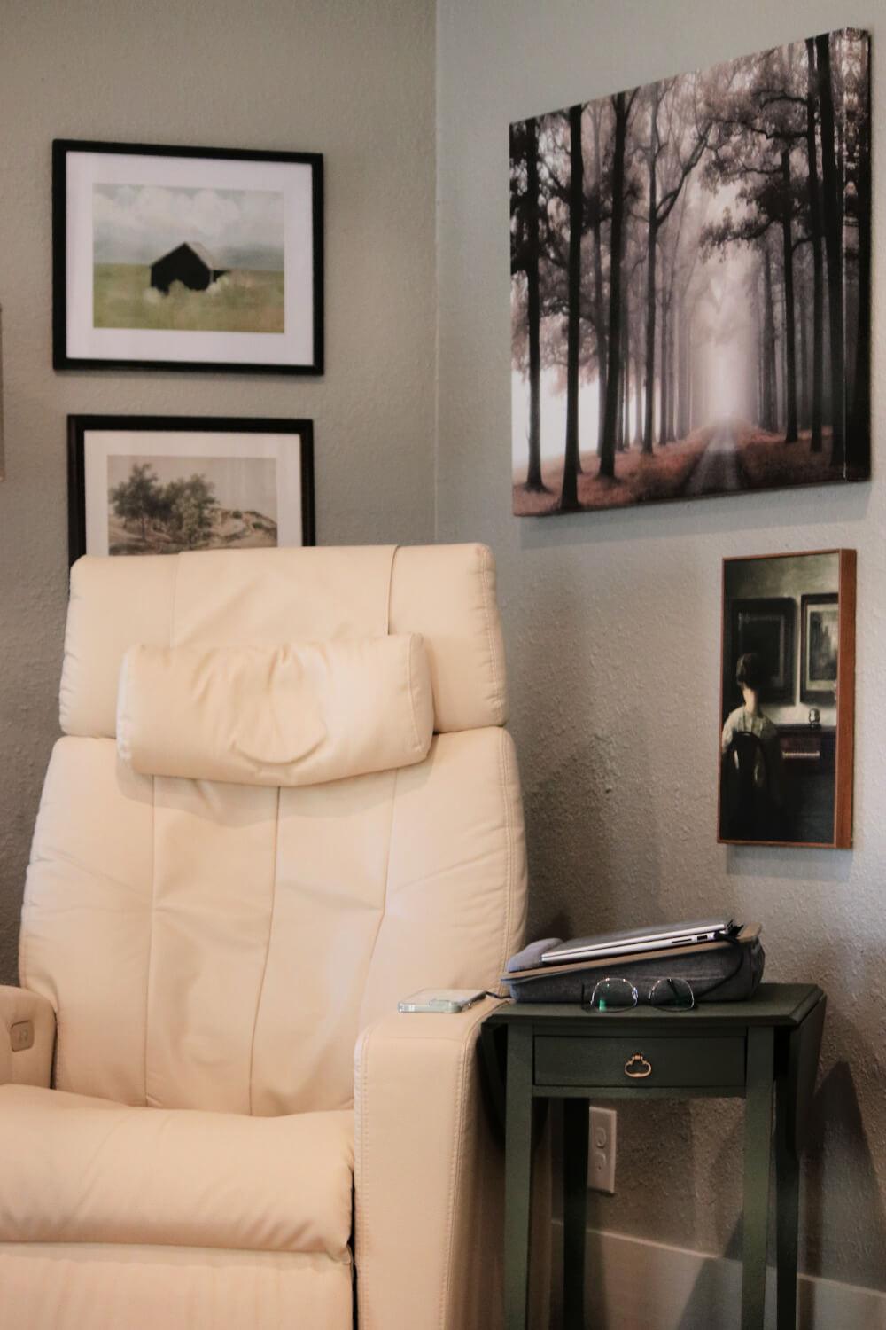 This is my chair and my office all in one. I sit here and write to you, review books, watch the cats play, and drink my one cup of coffee a day. It has a heat function, which feels lovely on my back.