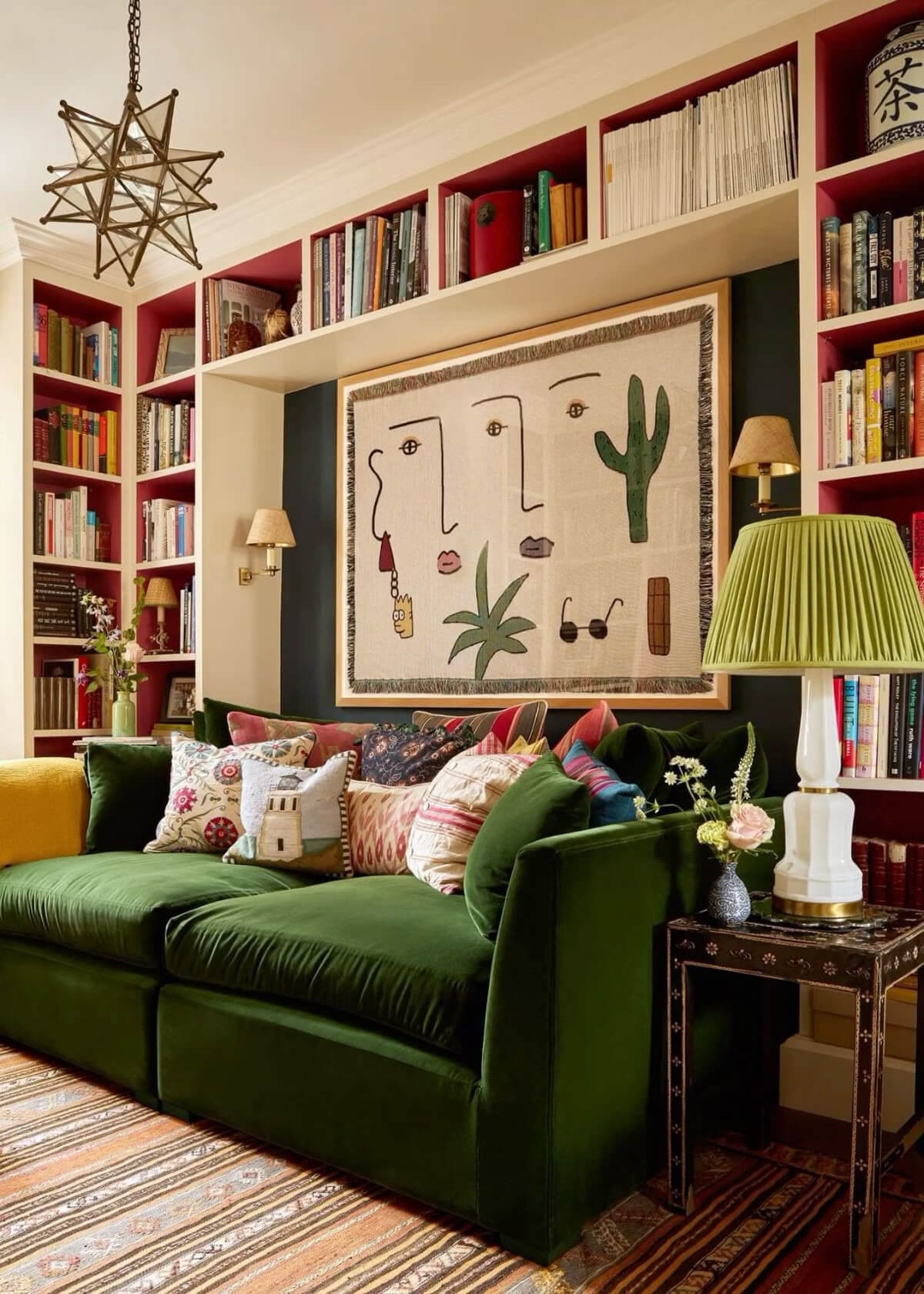 I too have a green couch much like the picture. If you told me in the past I would have a green couch, I would have definitely said no. No green, gray, black, or brown was my personal decorating guide until I found this particular shade of green, a cross between a green green with a tad of teal. It’s lush and cozy and soft and welcoming. Paired with your bookshelves, well, it would be perfect. Now if I just had room for bookshelves…