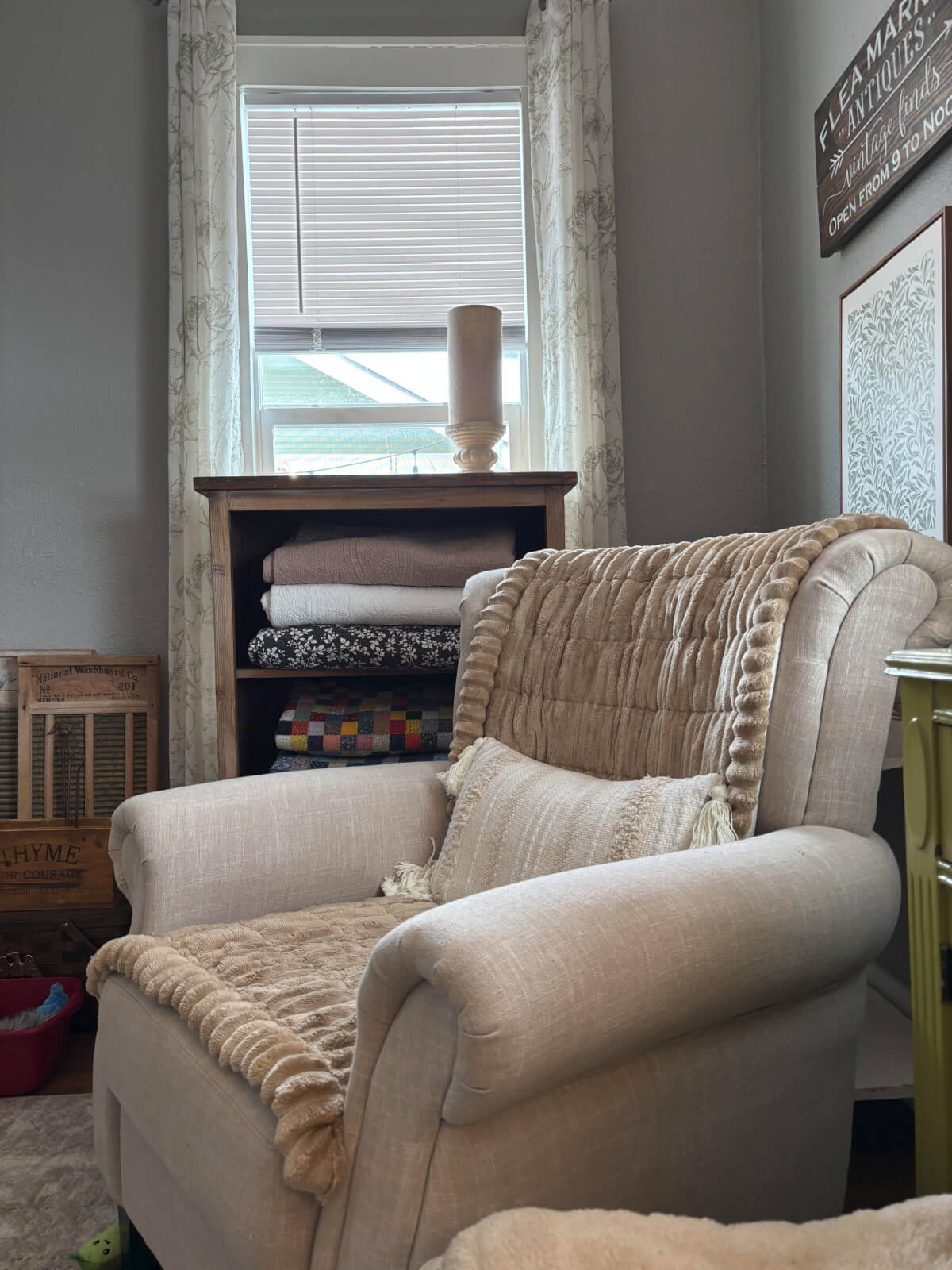 I love that grey blanket that you have on the chair!