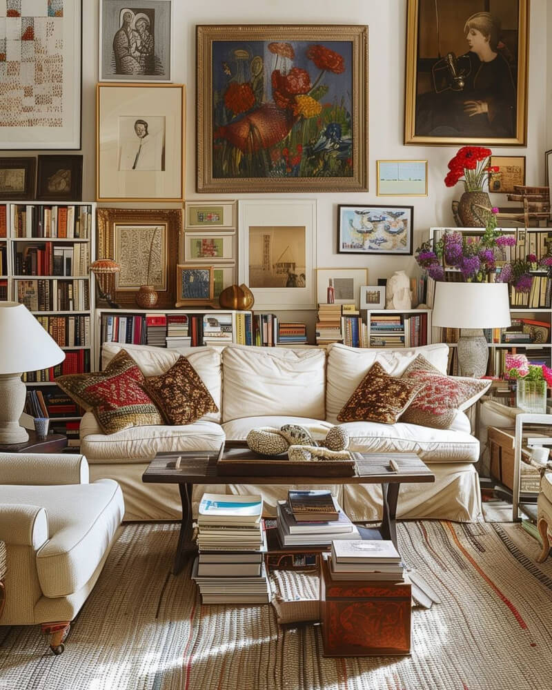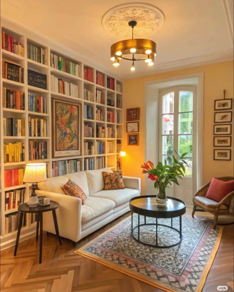 Of course, mine will be along the wall, leaving a path behind the couch to reach and access the bookshelves. But I like how these spaces are arranged.