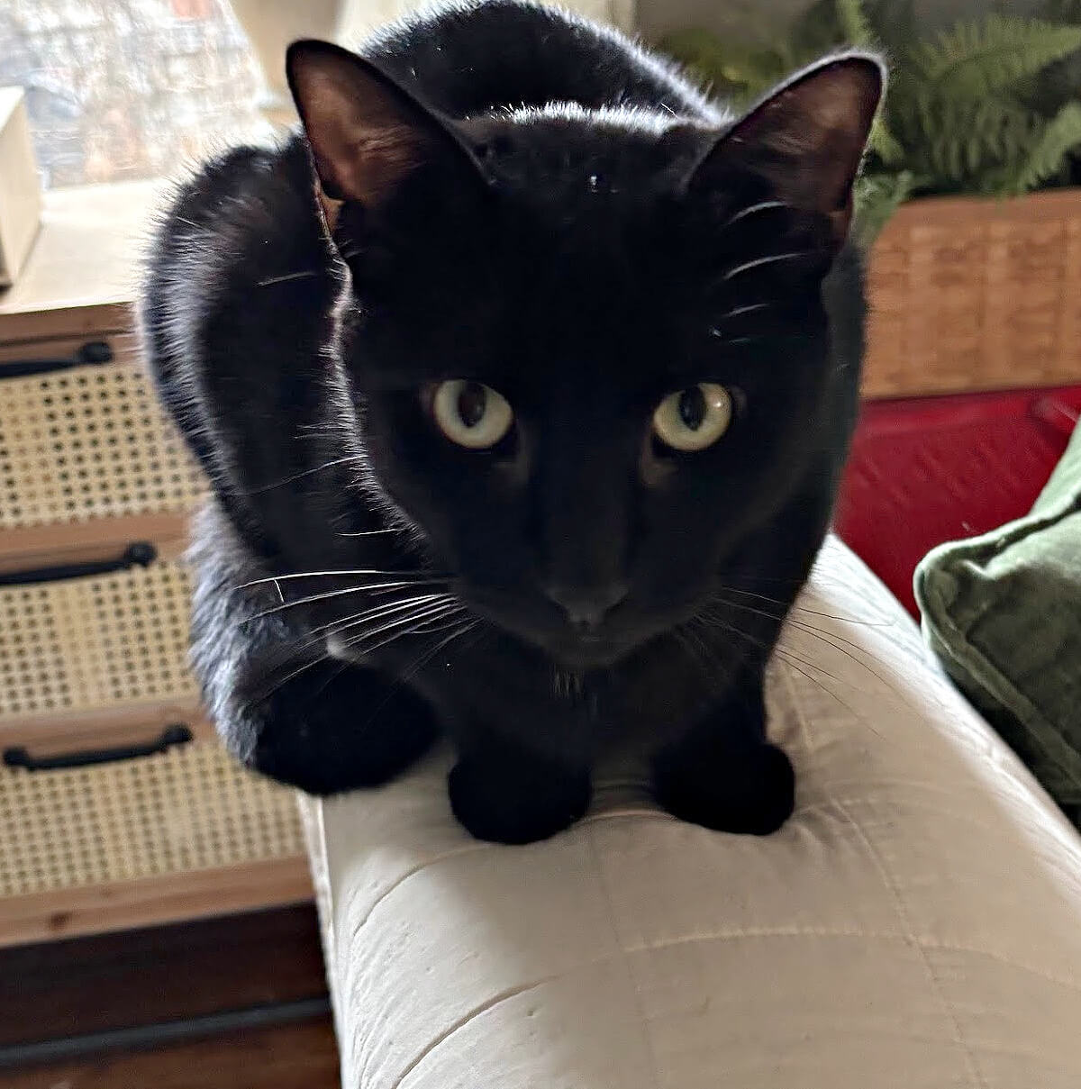 I had a black Asian Bombay cat that looked very much like your Simon. He was a wild child (fierceness bred into them I think) but also the most loving and needy kitty ever. He slept on me (not next to me, but on me) so he could snuggle. And he was a heavy cat … not fat, just muscle. And sleek silky black fur. I miss him dearly and love seeing pictures of Simon.